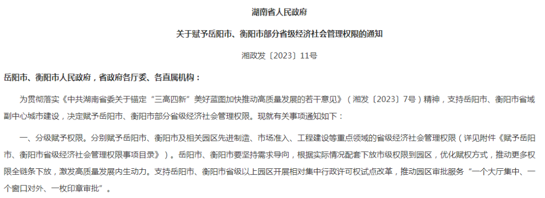 近日,湖南省人民政府发布了《关于赋予岳阳市、衡阳市部分省级经济社会管理权限的通知》,这是支持岳阳市、衡阳市这两个省域副中心城市建设的有力举措,从中可以感受到省委、省政府对推动省域副中心建设的高度重视和深切期许。