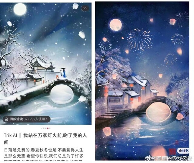央广网北京12月6日消息(总台中国之声记者周益帆)据中央广播电视总台中国之声《新闻纵横》报道,近日,四位绘画创作者将社交平台小红书的主体公司及小红书Trik软件主体公司诉至法院,引发关注。今年上半年,小红书推出AI绘画图片生成模型Trik,有粉丝发现,Trik账号随后更新的图片,画风及一些元素与一些画师的作品相似。