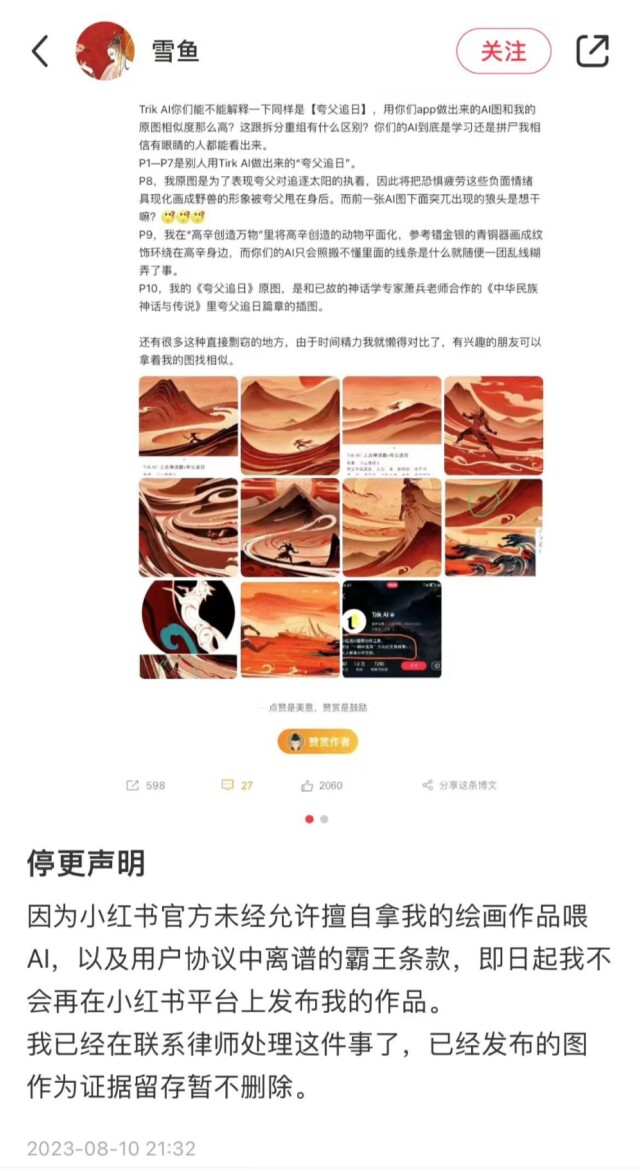 另一位画师“是雪鱼啊”在今年8月10日停止了自己小红书官方账号的更新,停更声明中写道:因为小红书官方未经允许,擅自拿其绘画作品“喂”AI,以及用户协议中的霸王条款,即日起不会再在小红书平台上发布自己的作品。雪鱼的许多创作灵感均来源于中国古代神话故事,在对比图片中,他展示了两者的“雷同”,例如,在夸父逐日这一主题中,雪鱼为表现夸父对追逐太阳的执着,将恐惧、疲劳这些情绪具象化为野兽的形象;而在小红书的AI软件Trik生成的图片中则出现了“狼”的形象。雪鱼认为,Trik本质上不是“生成式学习”而是将他的图片拆分重组。在青团子的说明中,也指出了配色元素及画面风格的高度雷同。