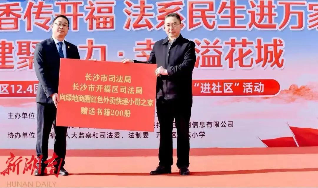 活动中,通过表演情景剧、律师以案释法向群众普及法律知识。为了帮助青少年了解法律、遵守法律,提高他们的法治素养和法律意识,开福区花城小学在现场成立了一支“宪法小卫士志愿队”。同时,开福区司法局以“五进五助”为抓手,结合“书香开福”活动,向社区的绿地商圈快递外卖小哥红色之家的读书角,捐赠了《法治的细节》《民法典下的财产继承》等200册法律相关书籍。