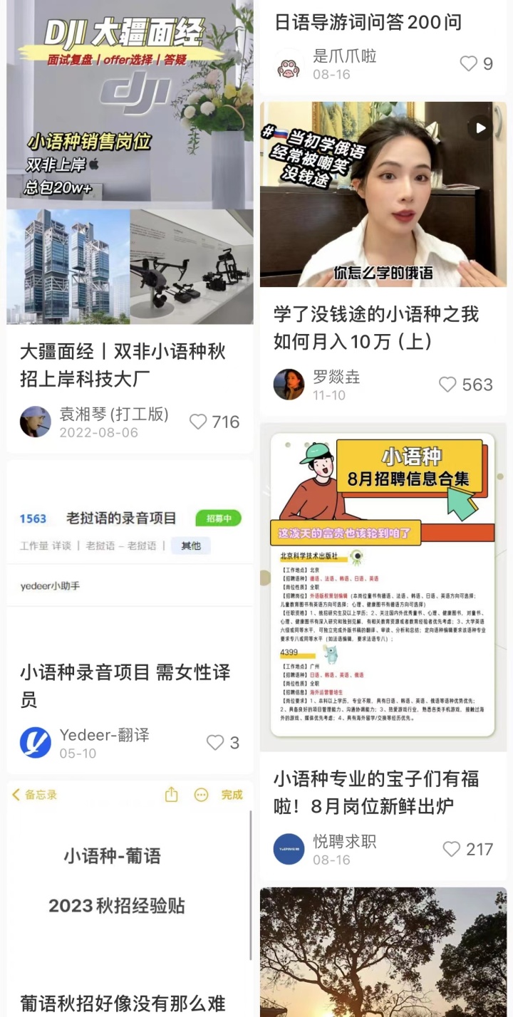 小红书上关于小语种人才的就业情况是热门话题之一。图源:小红书截图
