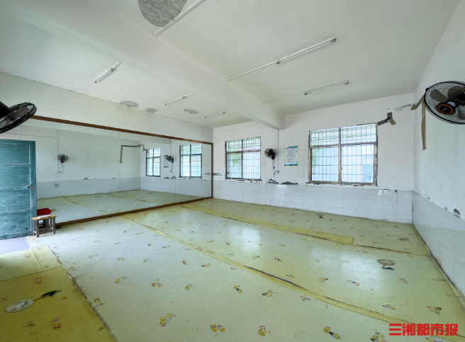 一间四五十平方米的教室,一面铺满墙的镜子,卡通的软胶地毯,这就是新岭小学舞蹈班上课的场地。每周一和周三的下午,邓娇会准时打开小音响,召集孩子们进教室热身,练习基本形体与体能。