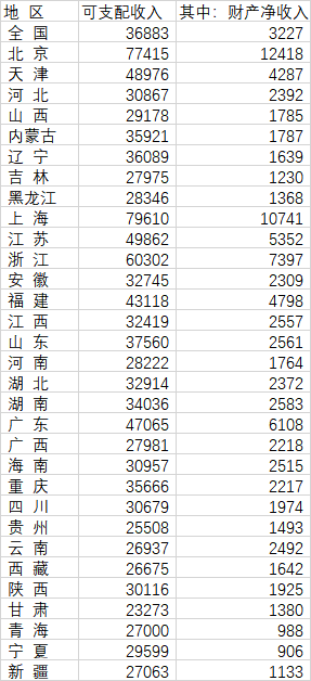 北京和上海两个强一线城市的人均财产净收入均超过万元大关,分别为12418元和10741元。上海和北京作为城市经济体,城镇化率高,现代服务业、高新技术产业、新兴产业十分发达,总部经济突出,高薪岗位多,吸引了大量人才集聚,居民的平均收入也高。