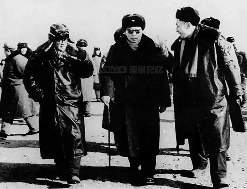 图:聂荣臻(中)、王淦昌(左)和朱光亚(右)在我国西部核试验基地