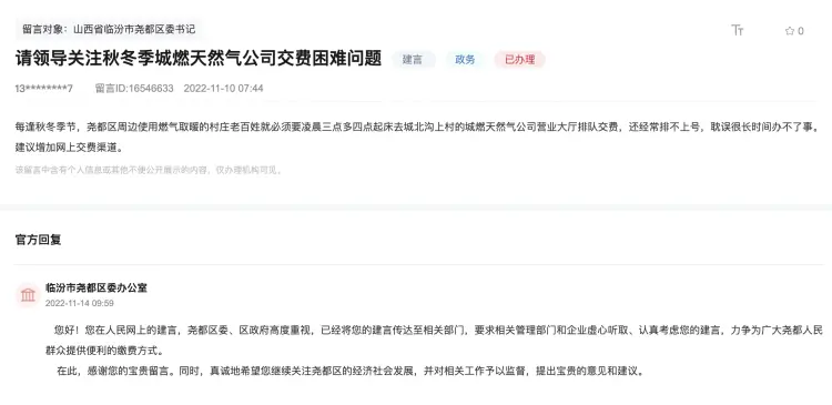 上游新闻记者搜索发现,自2019年起,每到11月-12月,就有当地居民在网上反映排长队交费难的问题。人民网领导留言板去年11月的一条建言显示,“每逢秋冬季节,尧都区周边使用燃气取暖的村庄老百姓就必须要凌晨三点多四点起床,去城北沟上村的城燃天然气公司营业大厅排队交费,还经常排不上号,耽误很长时间办不了事。建议增加网上交费渠道。”