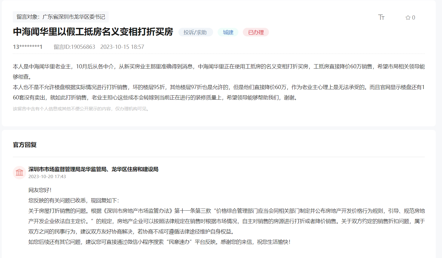 稍早的10月15日,一名自称深圳市龙华区中海闻华里老业主在领导留言板留言称,该楼盘以假工抵房名义变相打折买房。