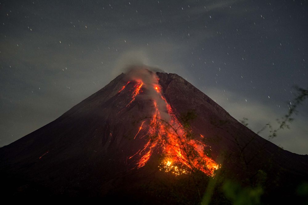 12月12日,在印度尼西亚日惹,默拉皮火山喷发出熔岩(长时间曝光照片)。新华社发(阿贡·苏普里扬托摄)