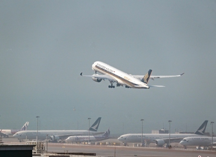 一架新加坡航空公司的客机从香港国际机场起飞。图片来自中新社