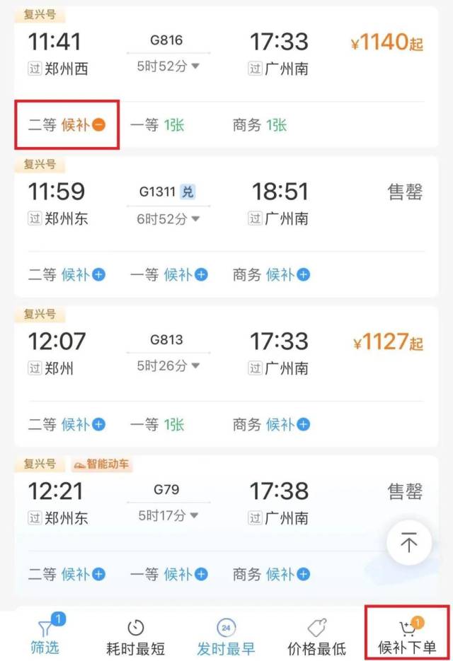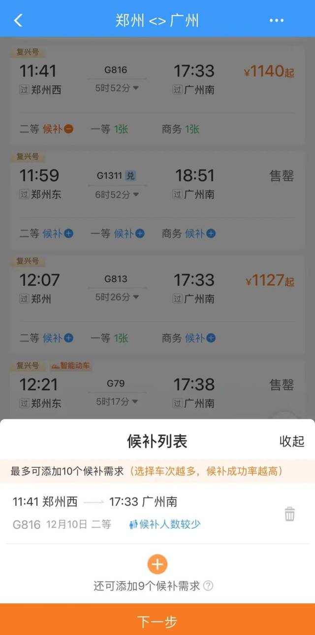 进入铁路12306App,选择需要候补的日期、车次、席位等,进行候补下单。
