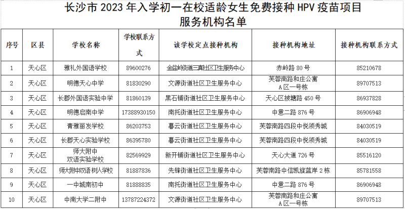 目前,长沙市启动了初一在校适龄女生HPV疫苗免费接种试点。按照“知情同意、自主选择、自愿接种”的原则,凡具有长沙市开福区、天心区、望城区、湘江新区学籍就读初中一年级,无接种禁忌,未接种过HPV疫苗且接种首剂HPV疫苗时未满15周岁的女生,给予免费接种国产二价HPV疫苗。