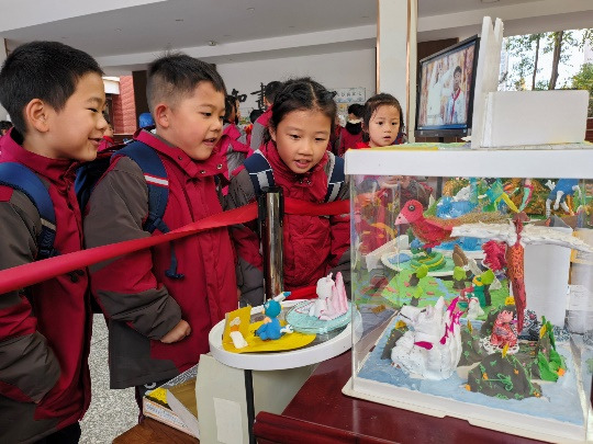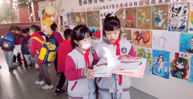 据悉,本次展览为该校四年级《山海经》整本书阅读的项目成果,展品皆为四年级同学创作。“读一本书,做一个展,对于四年级的孩子们来讲无疑是创新之举。在这个过程中,他们不仅感受、欣赏到《山海经》之奇、之趣、之美,也以充满想象力的作品诠释了对书中内容的热爱,让全校师生和家长近距离感受到中国优秀传统文化的魅力。”四年级语文教研组组长赵萍萍说。