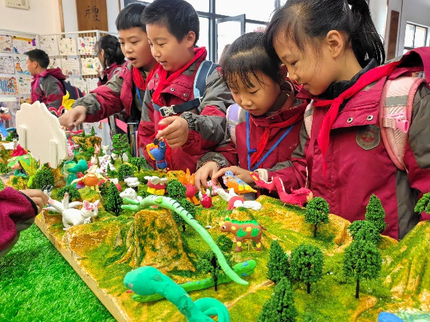 在“山海花园”展区,孩子们用泡沫搭建了一个迷你实景沙盘,加入了守护山神和神兽,九尾狐、帝江、六首蛟、凤凰、青龙……奇异神兽们仿佛从书本中跳脱出来,向观众讲述上古奇书《山海经》的浪漫与奇幻。