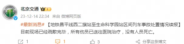 #最新消息#【地铁昌平线西二旗站至生命科学园站区间列车事故处置情况续报】目前现场已经疏散完毕,所有伤员已送往医院治疗,没有人员死亡。