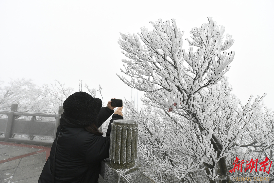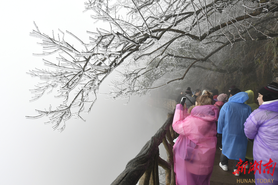湖南日报·新湖南客户端12月15日讯 (通讯员 赵锐 谭鹏波 邵颖)受寒潮影响,12月15日,海拔1500余米的湖南张家界天门山气温已低至零度以下。游道两旁的树枝上,晶莹剔透的冰花尽情绽放,就像是白色花蕾“开”在树梢,千姿百态、摇曳生姿。裹嵌在草木上的冰晶则结成各式各样美丽的冰凌花,犹如“玉树琼枝”晶莹剔透。整个山顶在漫山遍野的雾凇衬托下,仿若一幅唯美、宁静的水墨山水画,游客们行走在游道上,纷纷拿出相机手机将美景拍下。
