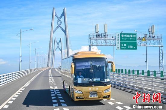 12月15日,港珠澳大桥旅游试运营正式开通。试运营阶段,持有效居民身份证的内地居民和已入境内地且持有效港澳居民来往内地通行证的港澳居民,可经港珠澳大桥珠海公路口岸出发,参团游览领略大桥风光。图为车辆经港珠澳大桥抵达珠海。