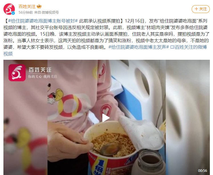 没想到这段视频热量不断上升,直接冲到热搜。12月15日,发布“给住院婆婆吃泡面”系列视频引发热议博主,主动承认画面系摆拍。住院老人其实不是婆婆而是自己亲妈,发布摆拍视频是为了涨粉。