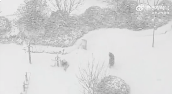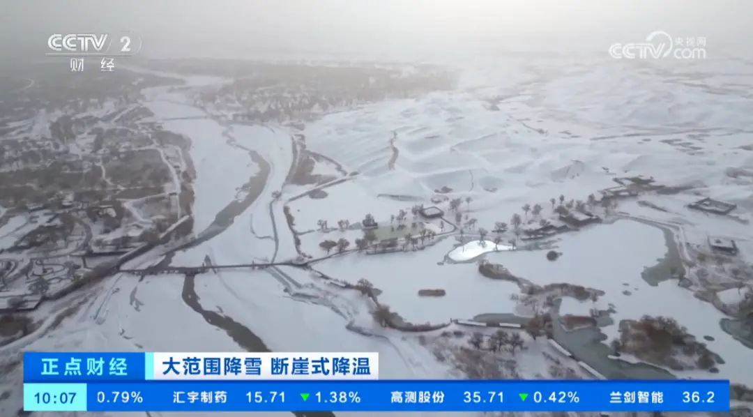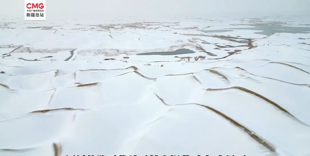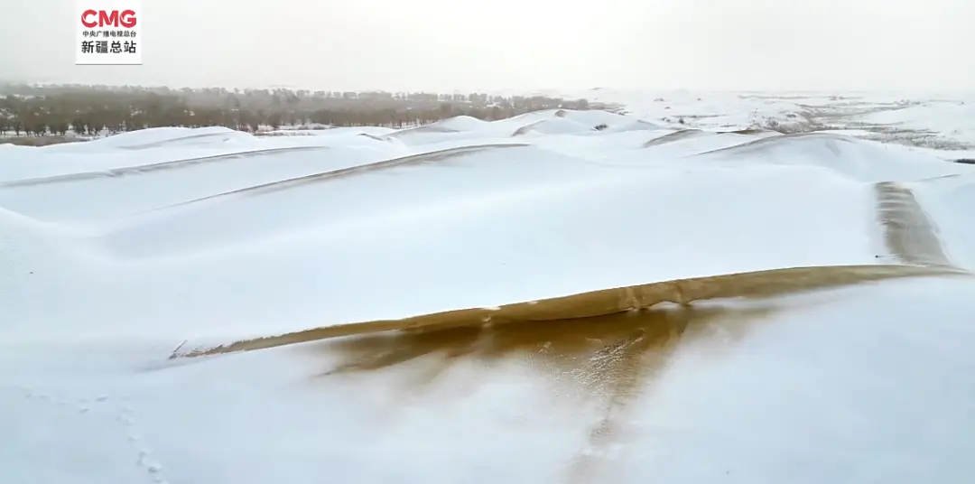 新疆巴州尉犁县境内的塔克拉玛干沙漠出现降雪天气,连绵不绝的沙丘披上银装。图片来源:央视新闻截图