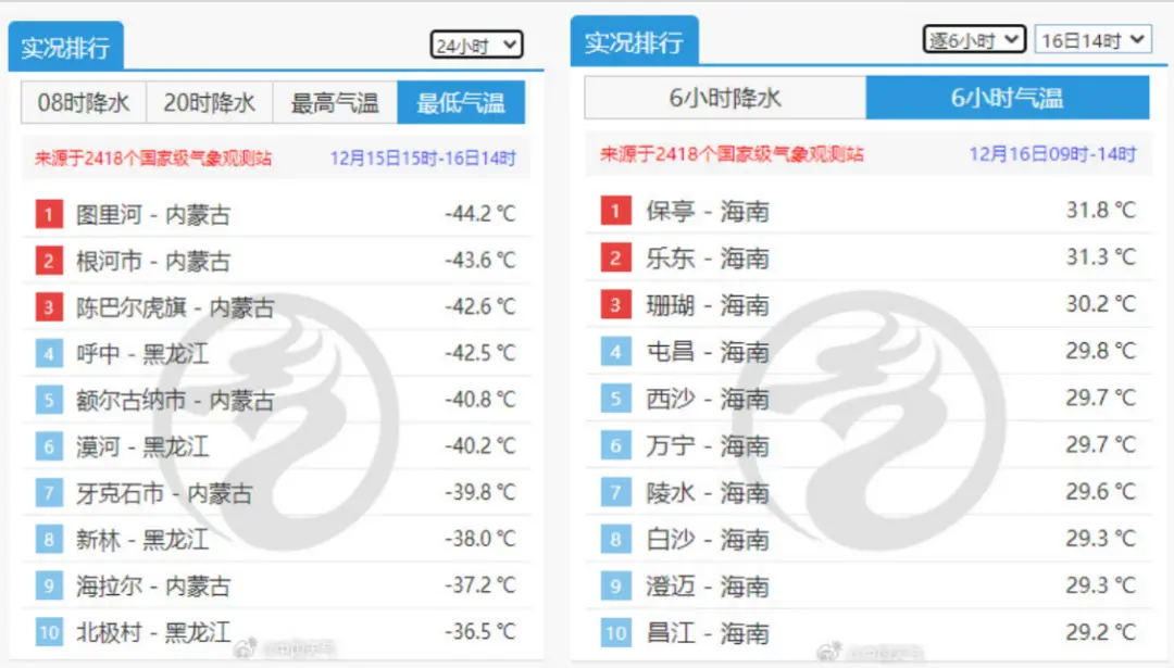 一到冬天便感受到祖国的辽阔!据@中国天气,12月16日,我国气温最高站点和气温最低站点的最大温差达到了76℃(内蒙古图里河-44.2℃→海南保亭31.8℃)。