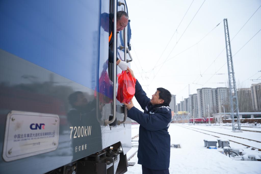在太原火车站,工作人员将应急食品送到机车司机手中。(中国铁路太原局集团有限公司供图)