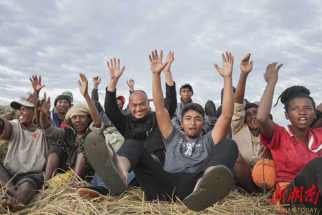 4月25日,马达加斯加马义奇杂交水稻高产示范基地,湘企专家和当地农民一起庆祝丰收。辜鹏博 王珏 摄影报道