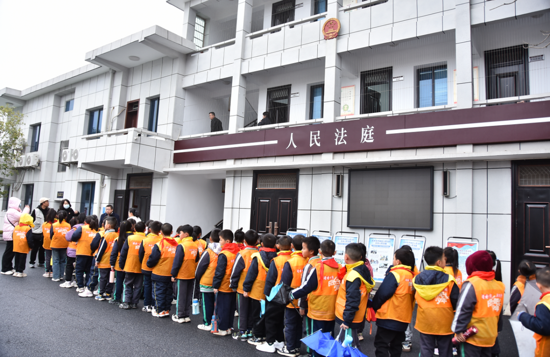 当日正值白关法庭开放日,孩子们排着队、打着伞在栏目工作人员以及班主任老师的带领下到达目的地——白关法庭。法庭工作人员热情地迎接孩子们的到来,为了加深孩子们的体验感,工作人员带着孩子们走安检通道,告诉孩子们,法庭是庄严神圣之地,进入法庭必须过安检。威武的法警也向孩子们展示了制暴工具。墙上显示屏、地上竖着的展板,是宪法宣传窗口,传递着法治的庄严与神圣。通过法庭工作人员的介绍,大家对白关法庭有了大致的了解,由于经济发展,人口增长及工业园的入驻,为方便辖区群众诉讼,白关法庭完成建筑翻新、硬件设施配备、信息化建设后投入使用并实行长期驻庭办公。目前占地面积约700m2,设置审判庭、接待室、立案室、调解室、办公及会议室,另配备工作所需全套硬件设施,接入全省法院三级专网。配备员额法官3人,法官助理1人,聘用制书记员3人,法警2人,现有工作人员共计9人。