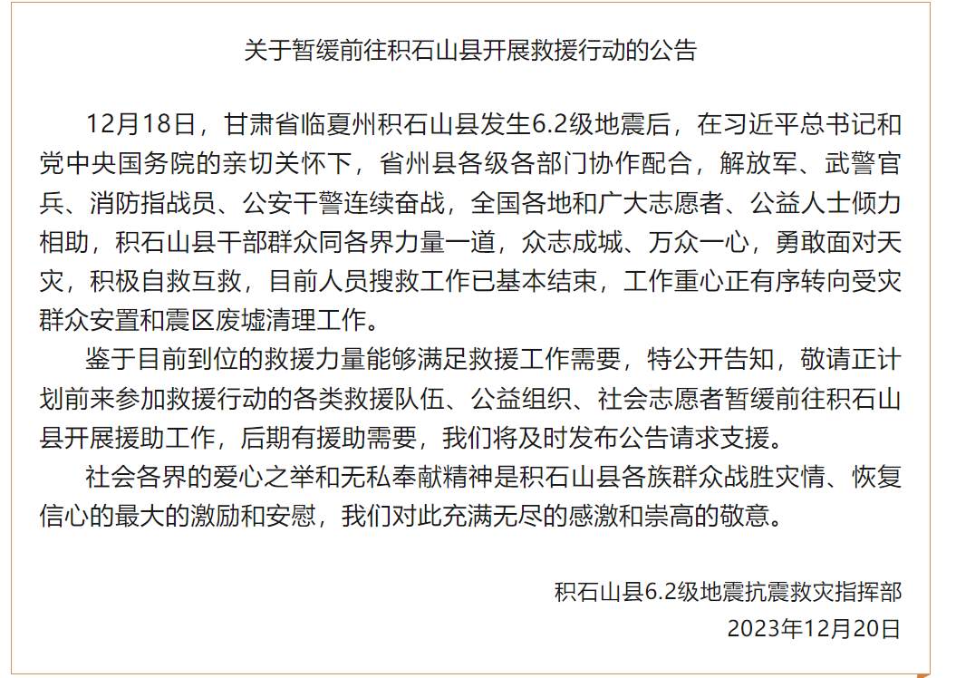 鉴于目前到位的救援力量能够满足救援工作需要,特公开告知,敬请正计划前来参加救援行动的各类救援队伍、公益组织、社会志愿者暂缓前往积石山县开展援助工作,后期有援助需要,我们将及时发布公告请求支援。