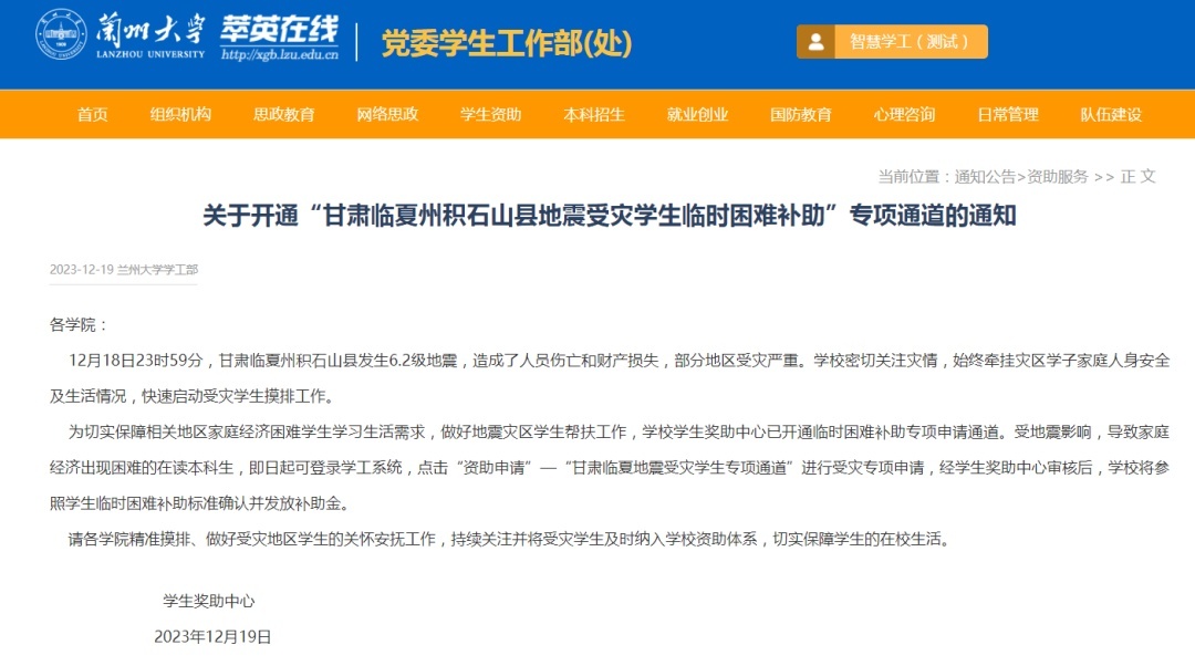 兰州大学快速启动受灾学生摸排工作,开通“甘肃临夏州积石山县地震受灾学生临时困难补助”专项通道。受地震影响,导致家庭经济出现困难的在读本科生,即日起可登录学工系统,点击“资助申请”—“甘肃临夏地震受灾学生专项通道”进行受灾专项资助申请,经学生奖助中心审核后,学校将参照学生临时困难补助标准确认并发放补助金。