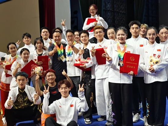 西北师范大学体育学院副教授温兵带队参加甘肃省大学生运动会武术比赛获奖合影。本文图片均由受访者提供