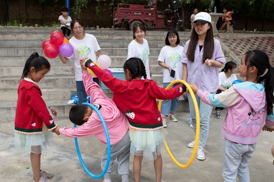 大学生志愿者利用呼啦圈带领乡村儿童开展体育活动。