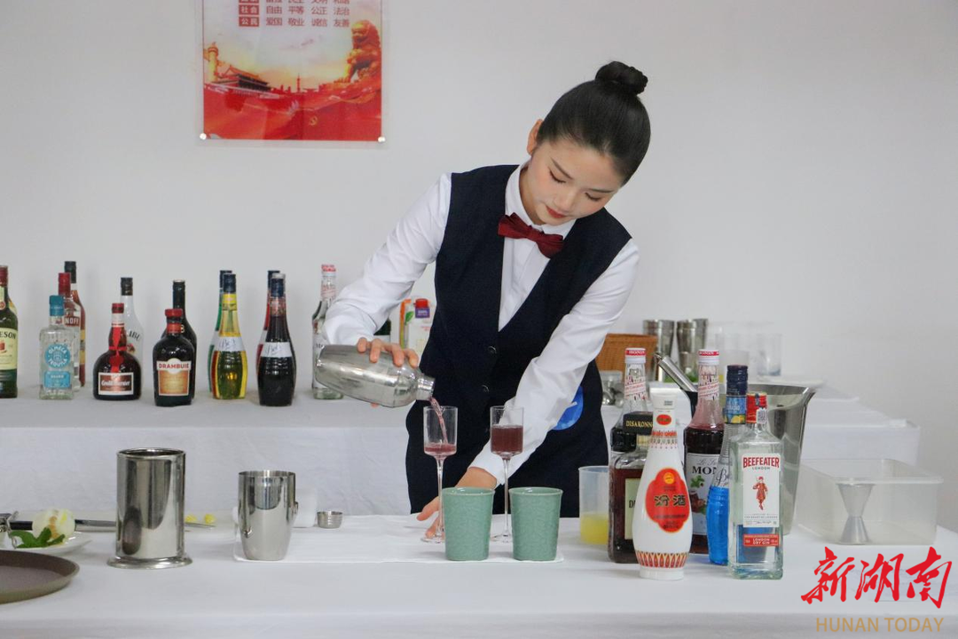 酒水服务赛项一等奖学生丁亚平在调制鸡尾酒