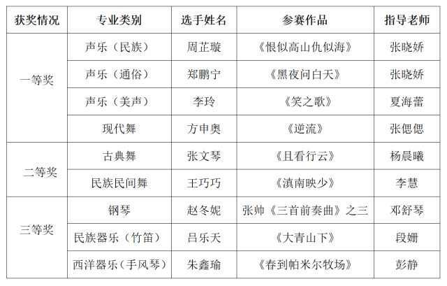 湖南日报12月20日讯(全媒体记者 余蓉 通讯员 袁娟)近日,湖南省教育厅公布湖南省第十一届本科院校音乐舞蹈专业学生独唱、独奏、独舞比赛获奖情况,湖南女子学院9名学生在与来自省内25所院校的234名选手竞争中,获得4个一等奖、2个二等奖、3个三等奖的优异成绩。