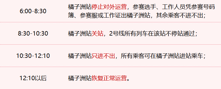 12月21日,长沙地铁发布消息,为配合“2023橘子洲红色半程马拉松赛”,12月22日,长沙地铁2号线首班车运营时间提前至6:00,其他线路首班车时间不变。此外,当日橘子洲站运营组织作如下调整: