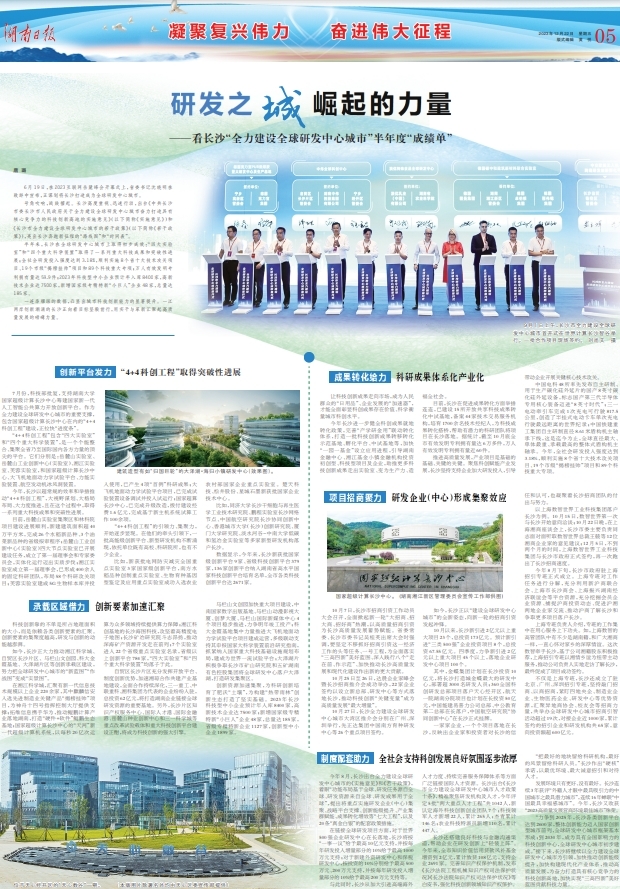 半年来,长沙在全球研发中心城市上取得初步成效:“四大实验室”和“四个重大科学装置”取得了一系列重大科技成果和突破性进展;全社会研发投入强度达到3.18%,顺利实施8个省十大技术攻关项目、19个市级“揭榜挂帅”项目和89个科技重大专项;万人有效发明专利拥有量达59.9件;2023年科技型中小企业预计年入库8400家,高新技术企业达7500家,新增国家级专精特新“小巨人”企业48家,总量达185家。