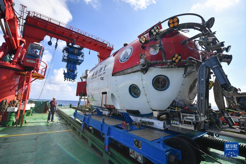 这是2023年5月26日在“探索一号”科考船上拍摄的“深海勇士”号载人潜水器,该潜水器用于水下考古数据采集。 新华社记者 蒲晓旭 摄