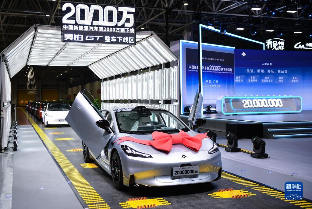 这是在位于广东省广州市的广汽埃安第一智造中心拍摄的中国新能源汽车第2000万辆下线活动现场(2023年7月3日摄)。 新华社记者 邓华 摄