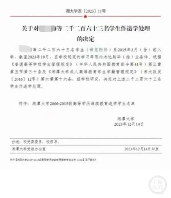 网传文件截图显示,截至2023年10月,2263名学生在学校规定的学习年限内未达到毕(结)业条件。“根据《普通高等学校学生管理规定》及《湘潭大学成人高等教育学生学籍管理规定》,经学校研究,决定对上述二千二百六十三名学生作退学处理”。