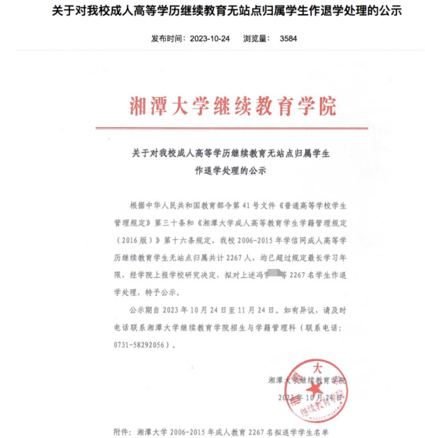 据上游新闻消息,12月22日,湘潭大学继续教育学院相关工作人员回应称:“这些学生都是成教学生,规定年限未达毕(结)业条件。学院官网已于2023年10月24日进行了公示,公示期满后,依据工作程序对上述名单的学生作出退学处理。上述处理决定红头文件是在校内传阅后被人发到网上的。”
