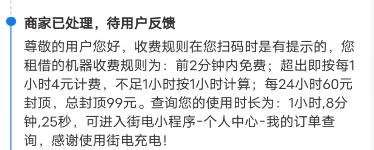 “11月25日,我在深圳机场用支付宝扫码租借了一个街电品牌的共享充电宝,用了不到半小时就没电了,当时附近没柜机无法及时归还,但充电宝订单却还在持续计费。”曾先生对记者说,他归还充电宝后,显示使用时长是1小时25分钟,扣费6元。曾先生表示:“只充电半小时,却按照1小时甚至更久的时间扣款,我不认可这些费用。”