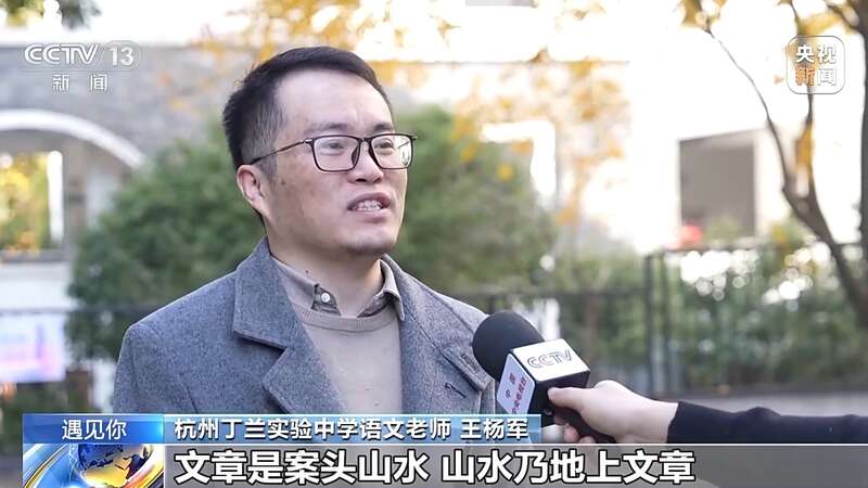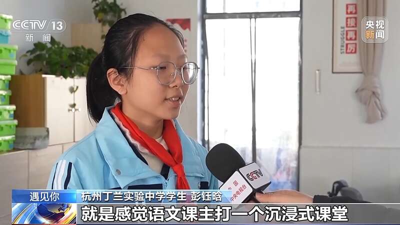 杭州丁兰实验中学学生 彭钰晗:每天有些时候其实挺盼语文课的,就是感觉语文课主打一个沉浸式课堂。特别是讲古诗文的时候,感觉就是跟着老师,跟着诗人一起体验的感觉。