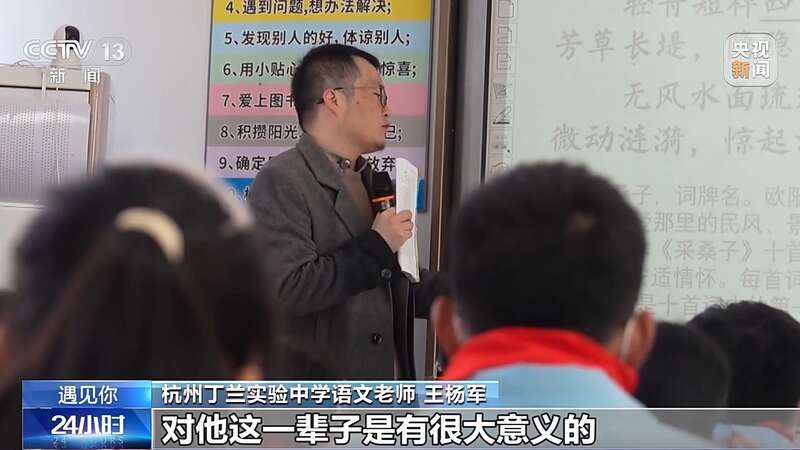 杭州丁兰实验中学语文老师 王杨军:让他们听着我的朗诵,然后你再来读,他们就能够感受到。因为不给他们做示范的话,让他们纯粹的指导他们哪些重音、停连,他们是没有很直接的感受的。你一定要有一个很好的范例去引领他。