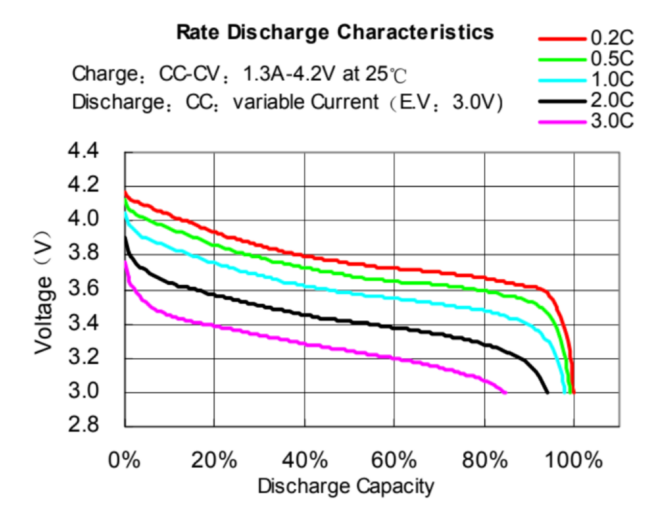 所以,手机也可以通过检测内部的电池电压变化,来判断电量的多少。比如,可以定义电池电压 4.2 V 时候为满电状态,即 100%,定义 3.3 V 时候为电量耗尽状态,即 0%,这时候手机就自动关机了(一般手机很少会真的把电池电压用到 3 V)。基于这样的曲线,手机就可以向我们显示剩余电量了。这个方法听起来很简单直接,但是也会有一些问题。最明显的一个问题是,在使用过程中,电压的下降并不是一个线性过程,从图中的曲线也能看出来,在电量快要用尽的时候,电池电压下降得比较快。如果严格按照这个曲线来显示,可能电量会突然从 15%掉到 0%,这可能会带来很多麻烦。不过这个问题还算比较好解决的,只要对显示的数据进行一些修正就可以。除此之外,光靠电压判断电量还会面临一个问题,那就是它会受到很多因素的影响。比如,在不同工作电流的条件下,电压下降的曲线也是不同的。不同工作电流的条件下,电池的放电曲线不同,我们称之为倍率性能,下面图片中就是在不同倍率条件下,电池电压的下降情况。