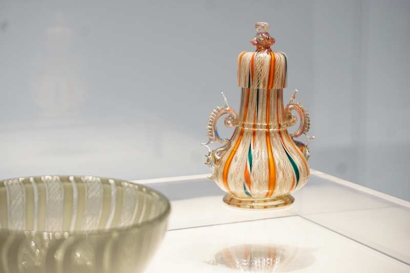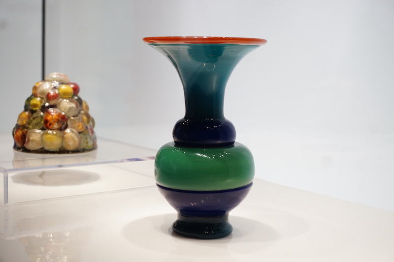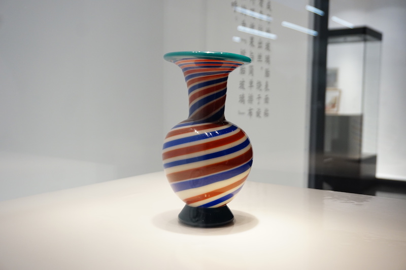 展览中的一件清乾隆时期的绕彩丝玻璃瓶很有现代感。绕丝工艺是在成形的玻璃胎表面粘附其他色彩的玻璃熔液,并将后者牵拉出丝,绕于旋转的玻璃胎芯上形成螺旋排布。