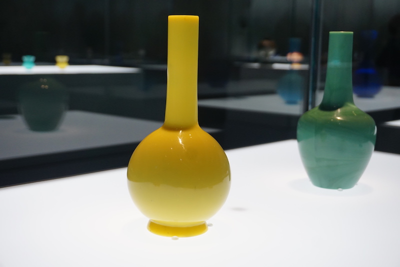 展览中的一件清雍正时期的黄玻璃天球瓶为模具吹制而成,通体呈均匀鸡油黄色,因色泽犹如新鲜的鸡油得名。烧制黄色玻璃的呈色金属是铁或锑,呈色有深有浅,其中鸡油黄色最是好看,但烧制难度也最大,成功率很低。这件作品色正且纯,呈色极佳,十分珍贵。