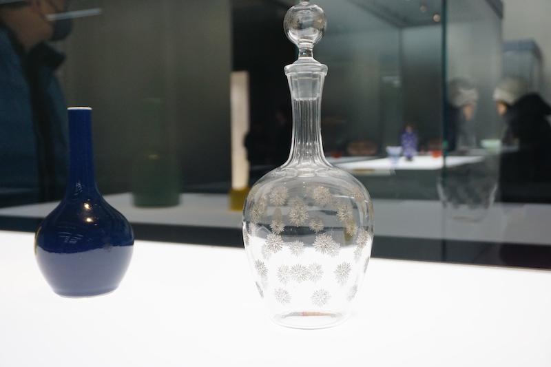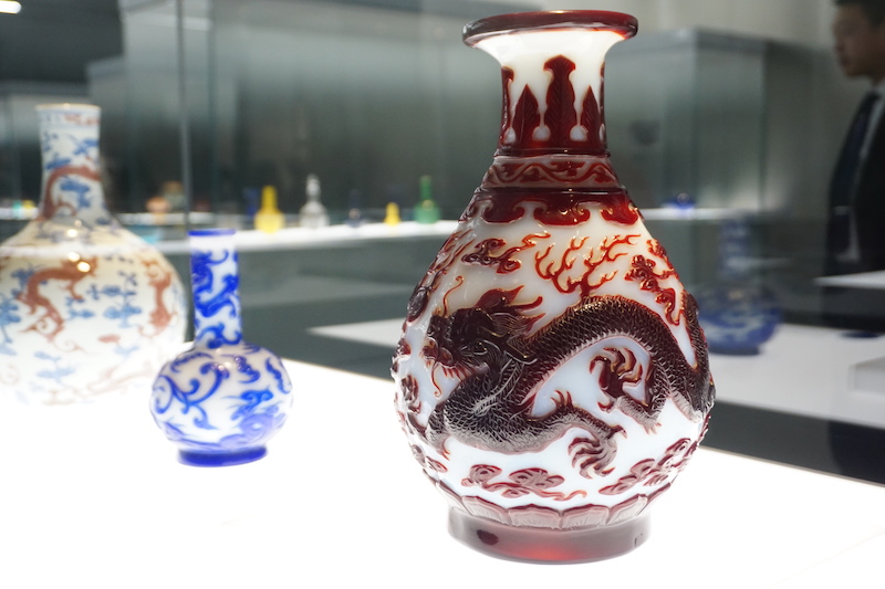 展览的第二单元就聚焦于清代玻璃器制作的各种工艺。《颜山杂记·琉璃》记载明代有生产“空之属”的泡灯、鱼瓶、佛眼等吹制器,现仅存明代模制玻璃仿玉配饰。清代宫廷引进了欧洲先进的玻璃配方,可以进行复杂的吹制操作。除自由吹制小件器物之外,模具吹制是制作复杂器物的重要手段。用金属吹管蘸取玻璃料探入器范中吹制,成形后脱范、打磨,辅以雕刻、绘画。