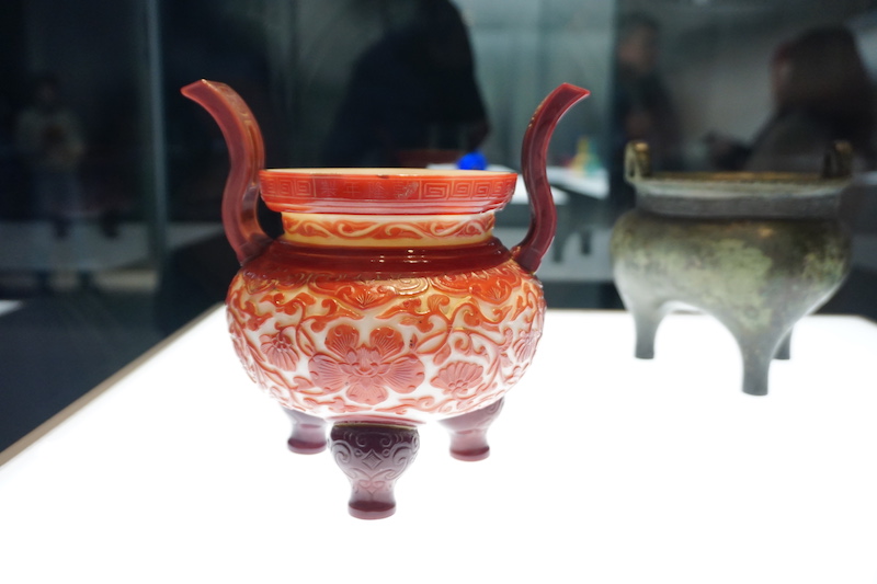 展览中,一件清乾隆时期的白套红玻璃缠枝花纹吊式炉,炉器身模具吹制成形,足与耳模铸后再用铆棒粘接成器,造型仿青铜鬲。鬲作为烹食器,最早出现于新石器时代,商代晚期转变为盛食器。乾隆时期出现套玻璃“五供”器,即一炉、两烛台、两瓶(觚)。鬲式炉是当时最常见的供炉类型。