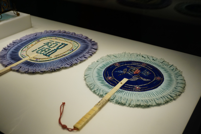 缎心绸边钉玻璃珠石榴纹骨柄团扇