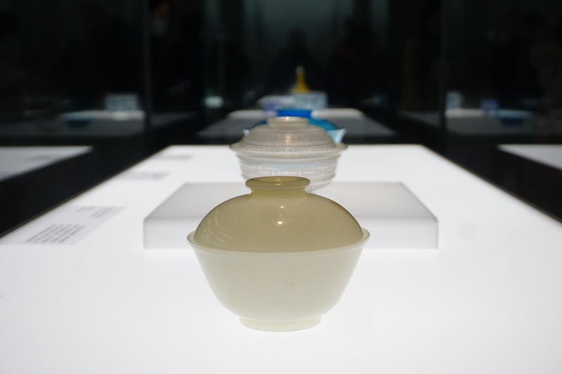 清宫收藏的西洋玻璃器,晶莹可爱,而这些19世纪的西洋玻璃器,也部分受到中国文化的影响。一件西洋透明玻璃回纹盖碗,碗盖、身遍布凸起菊瓣纹、小圆珠组成的回纹、联珠纹,为压模成器同时成纹。压模法是工业化生产玻璃器皿的主要方法。18世纪,欧洲为主的艺术品市场受到“中国风”影响,出现一批受东方传统器形影响的器皿,盖碗便是其中之一。