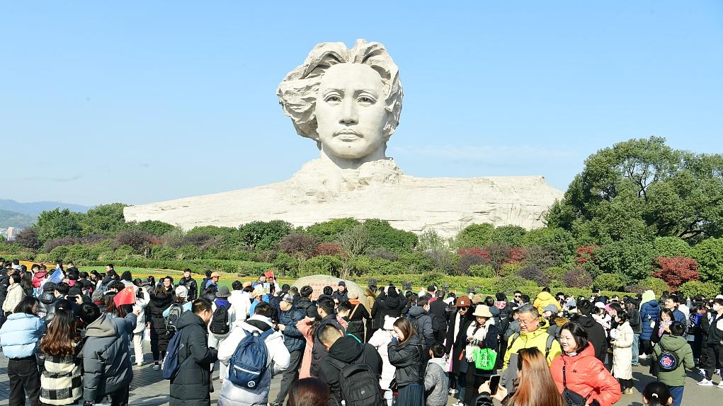 12月24日,湖南省长沙市橘子洲景区,来自各地的游客在毛泽东青年艺术雕塑前瞻仰、拍照留念。视觉中国 图
