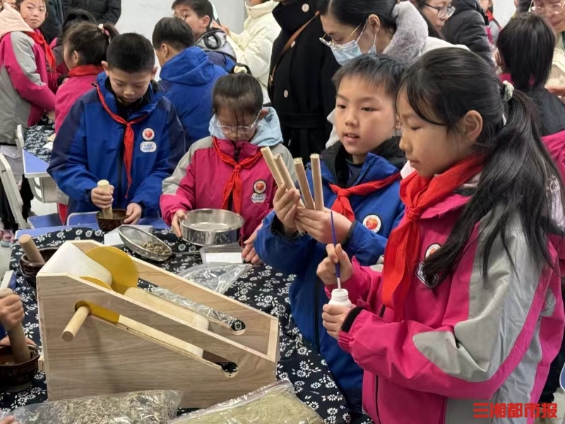 三湘都市报·新湖南客户端12月26日讯(全媒体记者 刘镇东 黄京)填、压、滚、拉……在长沙高新区明德麓谷学校一间教室中,X2003班的孩子们正奋力用石臼在器皿中反复捶打、粉碎艾叶,通过一系列工序制作艾条,这也是该校“中草药传承”特色劳动教育中的一环。
