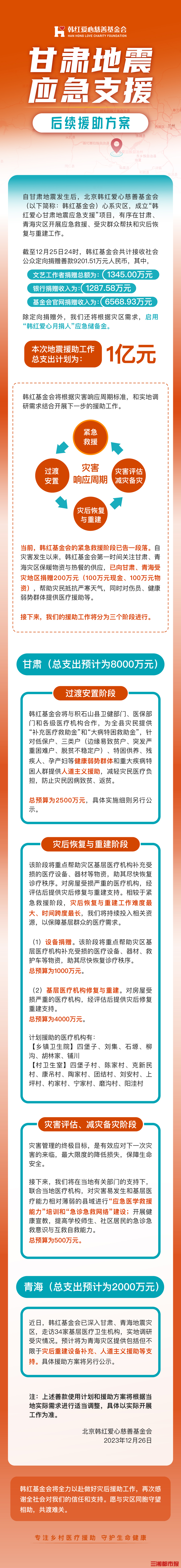韩红基金会发布甘肃地震后续援助方案:总投入1亿元,分三阶段推进